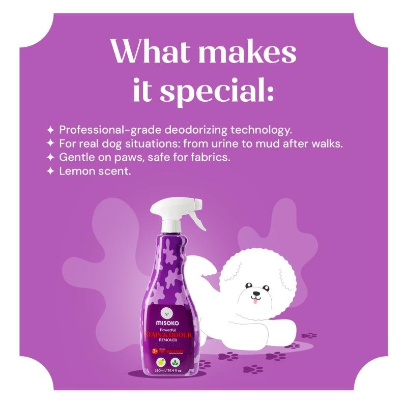MISOKO Dog Stain and Smell Remover – Lemon Scent, 750 ml, es una solución moderna que mantiene tu hogar limpio y fresco. La innovadora fórmula bioactiva PRO-BACTERIA™ funciona en profundidad: las esporas bacterianas descomponen la orina, las heces y otros residuos orgánicos, eliminando olores y manchas a nivel molecular. El aroma fresco a limón revitaliza instantáneamente el espacio, creando una sensación de limpieza y frescor. Diseñado para uso diario, funciona en suelos, alfombras, sofás, camas para mascotas y otras superficies comunes donde aparecen olores y manchas. Con un pH equilibrado y ingredientes suaves, es seguro para usar cerca de niños y mascotas, libre de cloro y productos químicos agresivos. El formato de 750 ml es ideal para el uso diario en casa. Su sistema de pulverización práctico garantiza una aplicación sencilla: simplemente rociar, esperar y limpiar